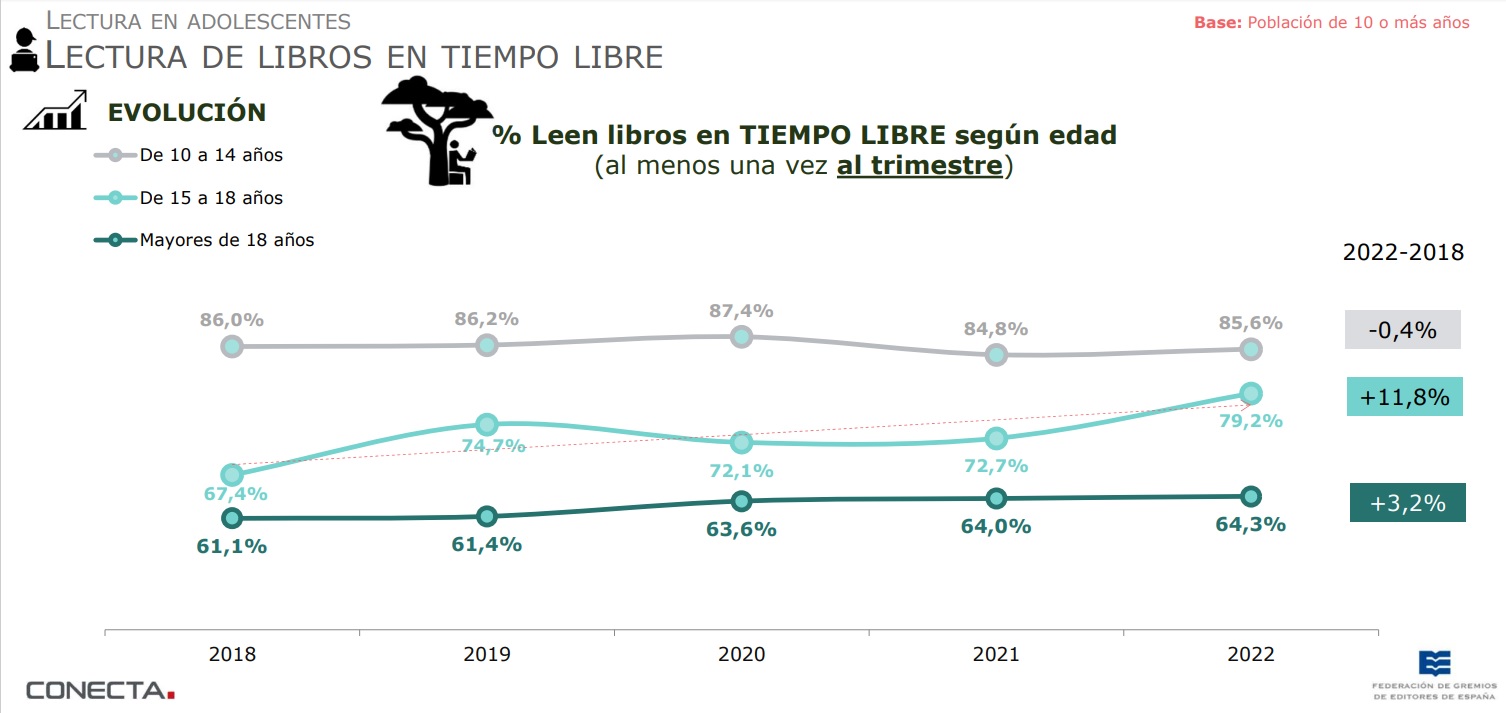 Los datos son, en general, muy positivos, destacando una idea en la que la Fundación Germán Sánchez Ruipérez lleva reafirmando desde hace tiempo: el porcentaje de lectores de libros es especialmente destacable entre los jóvenes. Además se confirma que los lectores por ocio en su tiempo libre continuaron su crecimiento en 2022, consolidándose así el crecimiento en los índices de lectura experimentado durante la pandemia.
