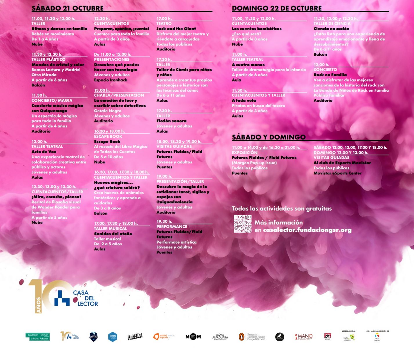 Desde las 11 hasta las 19.30h del sábado y durante toda la mañana del domingo se suceden la magia, la narración oral, las presentaciones literarias, los conciertos, las fiestas con personajes literarios, tertulias entre autores muy populares, charlas sobre eSports, talleres sobre tecnología...